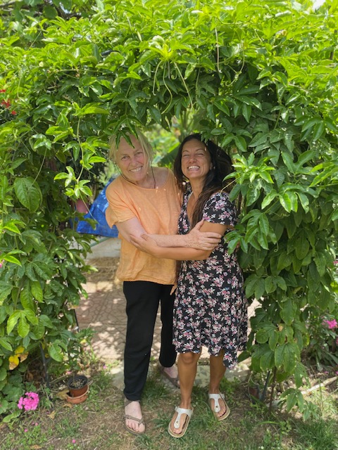 Danach fuhren wir zu einer Bucht bei Stoupa, in deren Nähe eine andere junge Freundin lebt. Als wir parkten, sah ich ihr Pferd herantraben. Im verwunschenen Garten war niemand, aber die Türen des winzigen Häuschens waren unverschlossen. Ich rief und öffnete eine Tür – und da kam sie schon heraus, große Freude. Unter dem Passionsbaum, den sie aus Amerika mitbrachte, ließen wir uns fotografieren.