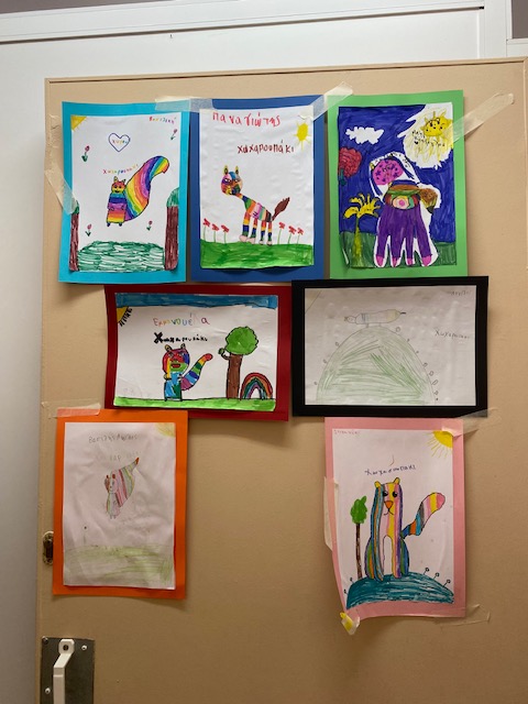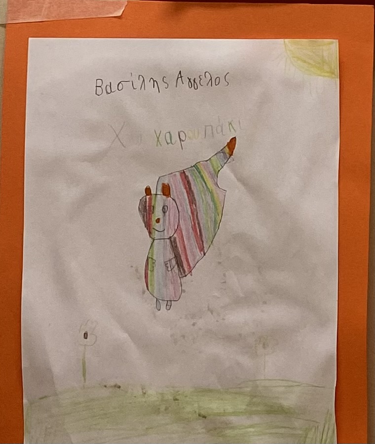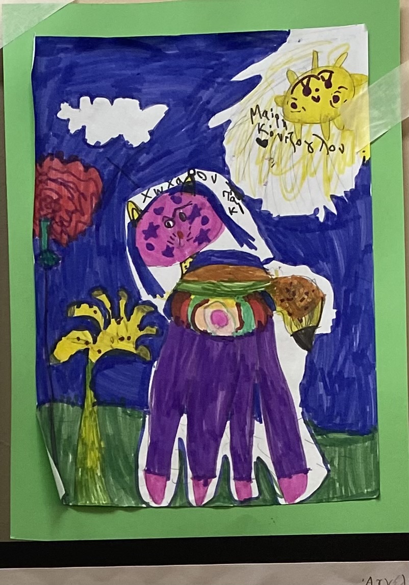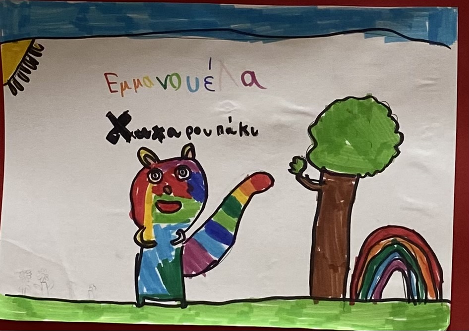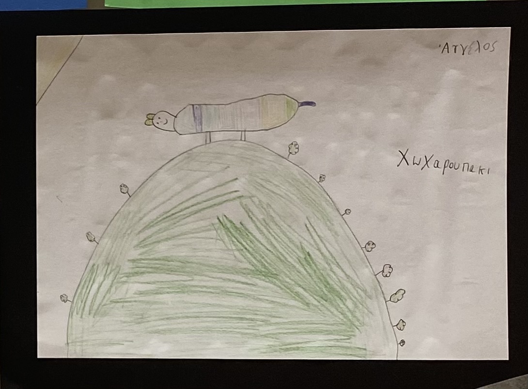 Das wars. War es das? Mal schauen, was uns die Kinder zum Wahltag zu sagen haben. Da ist der Panagiotis, der ein gestreiftes Katzenwesen mit vier kräftigen Beinen unter strahlender Sonne aufmarschieren lässt. Das Wesen heißt ΧΩΧΑΡΟΥΠΑΚΙ (Chocharupaki)**, nicht Kfbfk wie das von Calvino. Χω-χα (cho-cha. ho-ha) ist starkes Lachen, -aki ist eine Verkleinerungsform wie -chen, -lein. Also offenbar ein nettes Lachwesen.