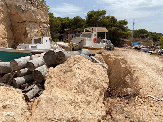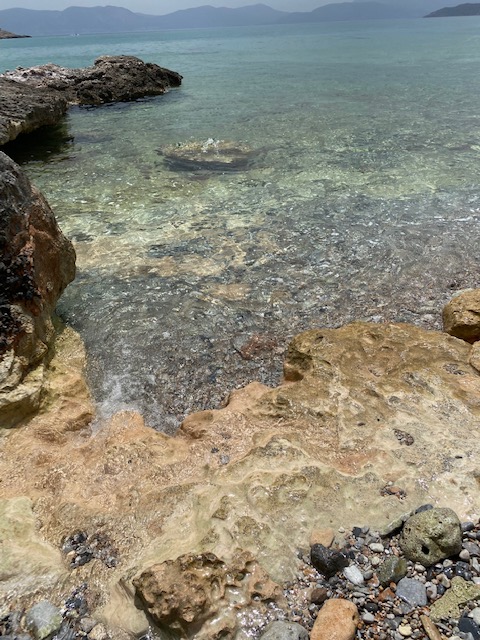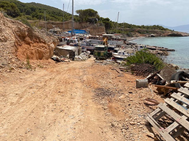Und was tue ich? Ich wandere los. Doch schon an der ersten Bademöglichkeit mache ich Halt, stürze mich ins Wasser. Danach geht es sich leichter, aber es macht nicht viel Spaß, denn die ganze Insel scheint eine Baustelle für Gästehäuser zu sein. Endlich winkt in der Ferne der Wald: Pinien! Doch leider kann ich ihren Duft zwar riechen, nicht aber in ihren Schatten treten, denn davor ist eine Art Schlucht, wohl ein Wildbach, der total ausgetrocknet ist. Bleibt nur, einen Weg an der Küste entlang zu suchen.