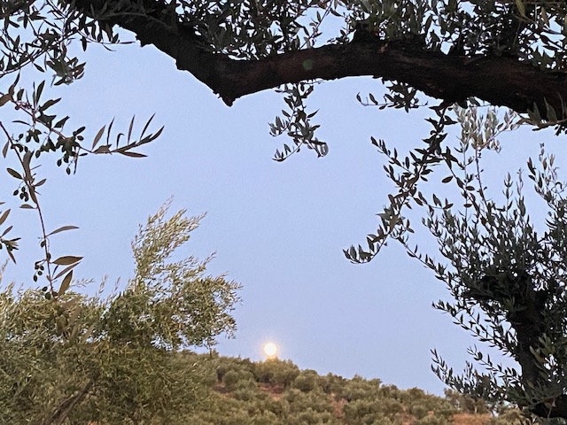 Hell ist der Himmel, als der Vollmond über den Hügel steigt. Es ist Hochsommer, und man spürt es. Der Tag war gluhheiß, die Temperaturen erreichten in Kalamata Höchstwerte. Bei uns in Meeresnähe und auf der Anhöhe waren es ein paar Grad weniger. Jetzt, in der Nacht, kühlt es merklich ab, der Schweiß kann trocknen. Auch die Erde atmet nun die Hitze aus, es duftet nach Bergtee. Über dem Meer liegt schwerer Dunst.