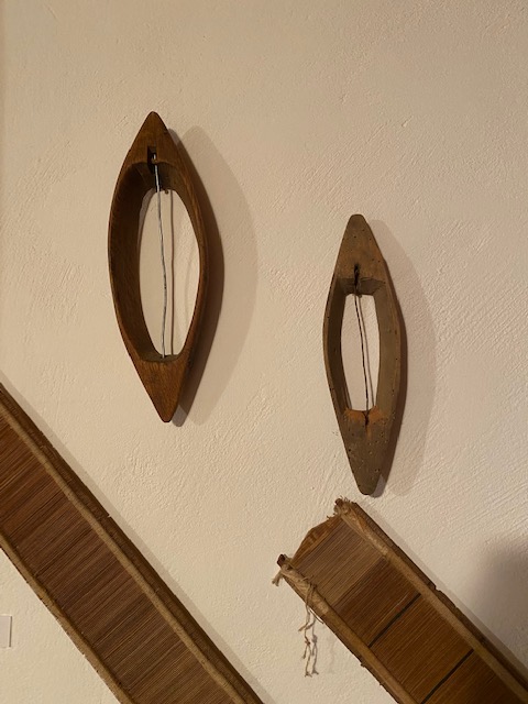 Vom Webstuhl sind nur noch einige Teile da, darunter zwei Weberschiffchen.
