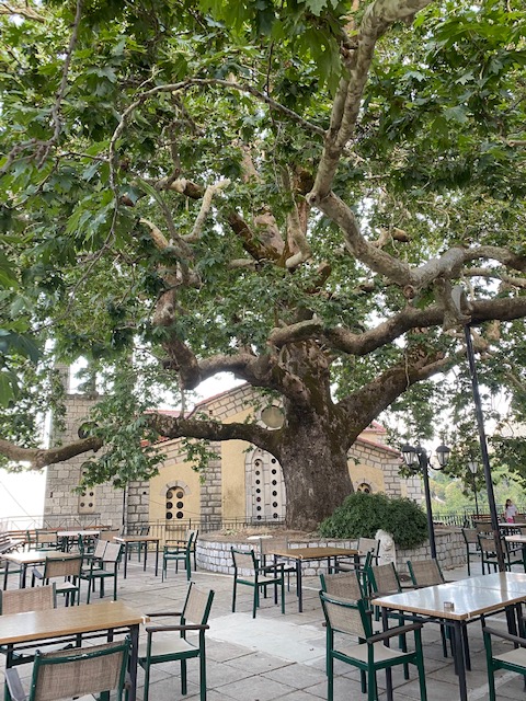 Das Dorf zieht sich locker am bewaldeten Hang entlang und konzentriert sich auf zwei Niveaus rund um je einen großen Kirchplatz. Die Kirchen sind prächtig, haben aber keine eigenen Pfarrer mehr, weshalb der heutige bedeutende Gottesdienst (Allerheiligen und Zwölf Apostel fielen, zusammen, wie mir erklärt wurde) nur im Nachbardorf zelebriert wurde. Auf dem Platz, der von einer gigantischen Platane überschattet wird, aßen wir zu Abend. Als wir kamen, waren noch keine Gäste da, später füllten sich dann ein paar Tische, denn es war ja ein sommerlicher Samstag abend.