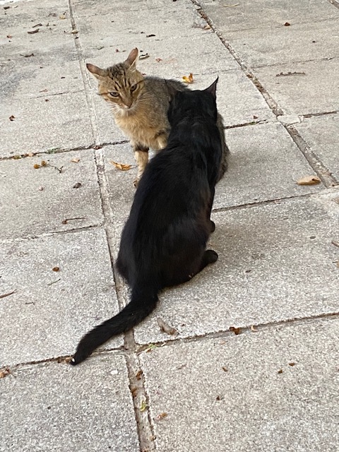 und zwei Kater, die sich ein spannendes Duell lieferten. (Der schwarze weinte den getigerten an, der seinerseits dem Blick und den drohenden Annäherungen tapfer standhielt, dann aber doch höchst vorsichtig Fuß um Fuß rückwärts setzte und schließlich davonschlich.)