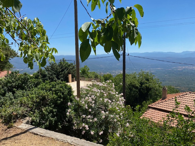 Das Dorf liegt auf 1000 m Höhe auf der „Rückseite“ des Taygetos (von uns aus gesehen). Man sieht von dort nicht aufs Meer, sondern auf das breite von Oliven und anderen Fruchtbäumen bestandene Tal des Evrotas – des Flusses, an dem die schöne Leda Zeus in Gestalt eines Schwans empfing und danach zwei Zwillingspaaren das Leben gab, von denen je ein Teil sterblich, der andere unsterblich war. Ihr kennt sie dem Namen nach: die Dioskuren („Zeussöhne“) Kastor und Polydeukes (Pollux) und die für Griechenland so schicksalhaften Schwestern Klythaimnestra und Helena. Dahinter das Parnona-Gebirge, das Lakonien von Arkadien trennt.