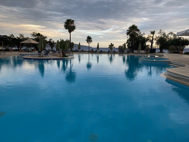 Nach einem schwülen Tag trafen wir uns abends mit Athener Freunden, die ihrerseits mit Freunden – Studienkollegen (Kardiologen) aus Portugal, Deutschland, Serbien und Griechenland – in einem Hotelkomplex von Kalamata abgestiegen waren. Seit vielen Jahren sind sie befreundet und treffen sich jährlich einmal an wechselnden Orten. Bei der Tischdebatte ging es hoch her, Meinungen über die Situation in Europa, über Krieg und Frieden in der Ukraine, und welches die richtigen Wege seien, stießen hart aufeinander und warfen Wellenberge auf. Umso friedlicher wirkte die Pool-Landschaft.