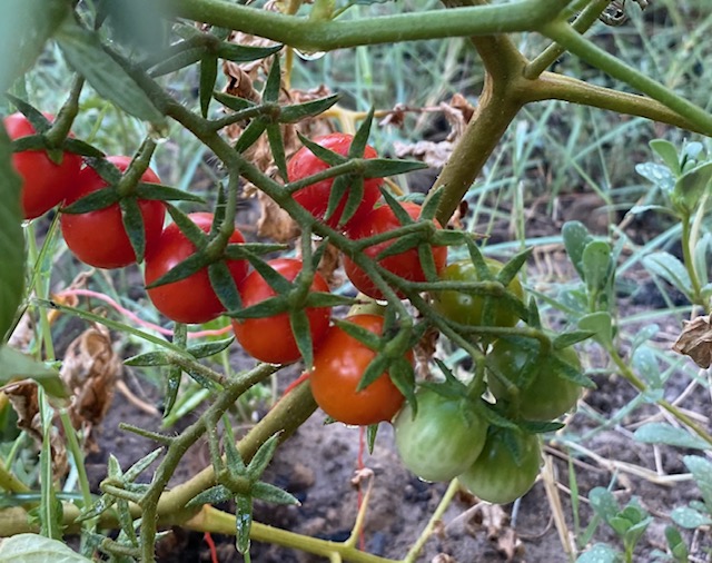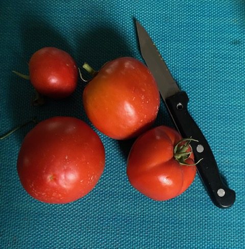 Die letzten Tage sind so heiß, dass mein kleiner Gemüsegarten hart zu kämpfen hat. Die einzige noch vorhandene Gurke hat den Geist aufgegeben, ebenso die Salatköpfe. Die Kürbisse und Paprikas lassen sich durch abendliche reichliche Wassergabe immer wieder zum Weiterleben überreden. Die einzigen, die recht robust der Hitze standhalten, sind die Tomaten. Ihre Blätter sind zwar auch etwas kümmerlich zusammengezogen, aber die Früchte reifen aus, und so konnte ich heute wieder eine Handvoll heißer Tomaten ernten. Eine aß ich gleich auf: warm vom Busch schmecken sie mir am besten.