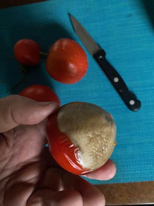eine solche hitzegeschädigte Tomate sah ich noch nie zuvor, negativ erstaunlich!