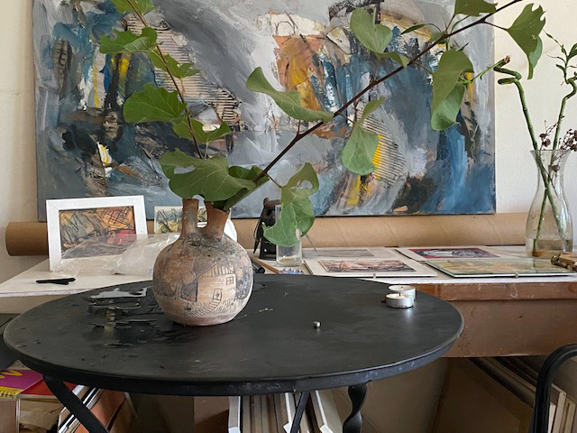 Vase vor Gemälde auf rundem Tisch (tägliches Zeichnen)