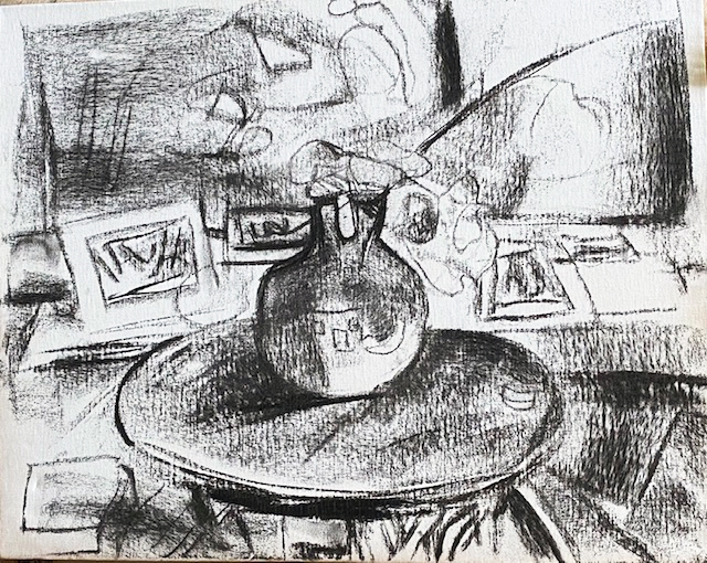 Vase vor Gemälde auf rundem Tisch (tägliches Zeichnen)