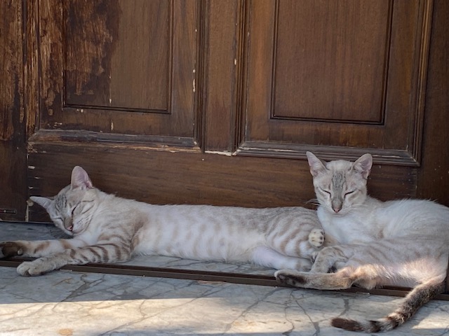 Die Türhüter Lin und Lan kennt ihr ja schon zur Genüge. Sie lieben den Schattenstreifen und die kühlende Marmorschwelle vor der Haustür, die einst von Tito zerkratzt wurde (es war seine Art anzuklopfen). Witzig finde ich, dass der Marmorboden und die Farbe der Kater fast identisch sind. Dazu ein bisschen Braun der Tür…