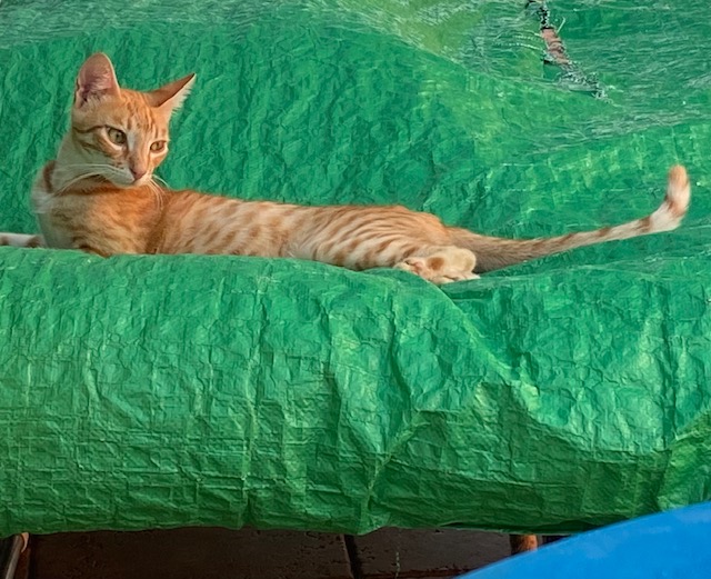 Dieser Kleine – ein noch namenloses Katerchen – hat heute die plastizierte Schutzdecke auf unserem Bett als Lager entdeckt. Auch er scheint einen besonderen Sinn für passende Farbkombinationen zu haben. Gold und Grün ergänzen sich vortrefflich.