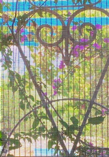 Dasselbe Fenster. Es ist halb zwölf mittags. Die Lichtblende ist nun transparent für das blaue Gestänge der Weinlaube, und das Violett und Goldgrün der Bougainvillea dahinter.