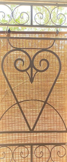 Das Eulengitter hinter der Jalousie zeichnet sich scharf ab. Aber die Mauer und die Bäume dahinter sind unsichtbar geworden. Hm.