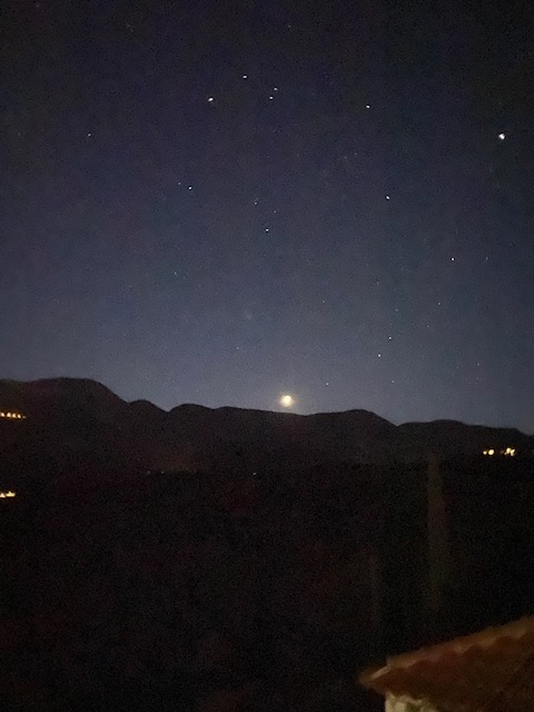 Heute gegen fünf Uhr nachts sah ich die feine Sichel des abehmenden Mondes wie ein goldenes Boot über dem Gebirgskamm aufsteigen. Der Anblick beglückte mich. Da ich um die Zeit meist schlafe, war es für mich ein ungewohntes Erlebnis. Die Sichel würde nun über den weiten Himmel schippern, bald nur noch als ein weißes Federchen sichtbar.