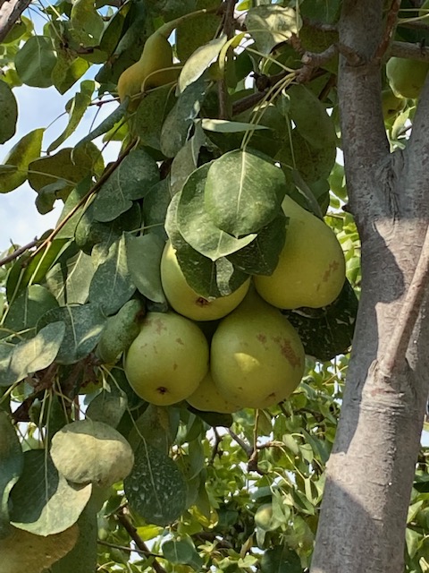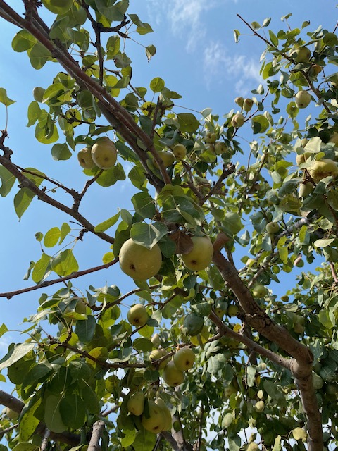 Es ist ein knochentrockener wilder Birnbaum, der an der Landstraße steht. Die Früchte, die er hervorbringt, sind ziemlich holzig. Jedesmal, wenn ich vorbeikomme, prüfe ich, ob sie schon essbar sind. Denn kaum ist es so weit, sind sie auch schon weg. Der Pächter eines Stücks Land, auf dem er Schafe und Ziegen bis zur Schlachtreife heranzieht, holt sie sich als Futter. Also muss ich aufpassen, wenn ich ein paar Birnen erwischen will.