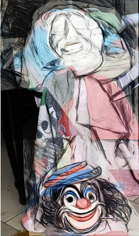 Diese Maske steht in einem starken Kontrast zum Clowngesicht. Ihre Züge haben für mich wenig Vertrauensvolles. Während mich der Clown zum Spiel einlädt.