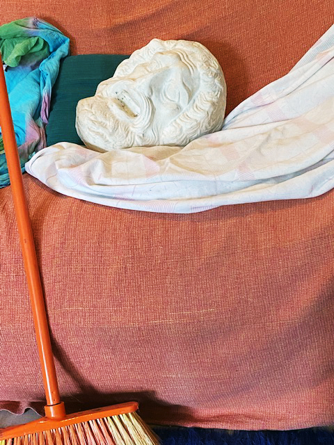 Maske im Atelier (6), mit Draperie und Besen