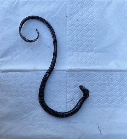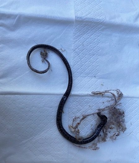 Heute habe ich wieder ein Schlänglein im Atelier gefunden. Es war noch weich, aber winzige Ameisen hatten sich bereits eingefunden und rückten ihm zuleibe. Ich befreite es von Staubflusen („Staub sollst du fressen, und mit Lust, wie meine Muhme, die berühmte Schlange“). Tatsächlich hat sie diesen Staub irgendwo aus hintersten Ecken zusammengetragen, denn im Sichtbereich ist mein Atelier ziemlich sauber.