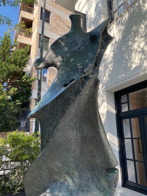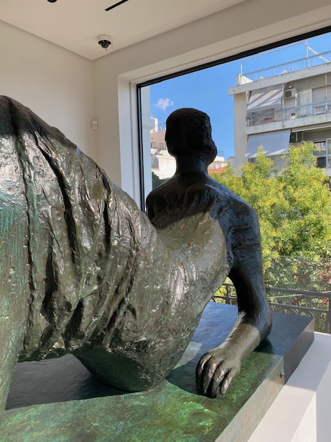 Heute fuhr ich wieder nach Athen rein, diesmal, um Werke von Henry Moore anzuschauen. Und es lohnte sich. Das villenartige Gebäude der Galerie Gagosian am Rande des Lykabettos ist im Inneren ein weißes schlichtes Gehäuse, das sich vortrefflich für den Ausstellung von Skulpturen eignet – bis zu einer mittleren Größe freilich nur. Eine riesige Skulptur hat man vor dem Eingang platziert.