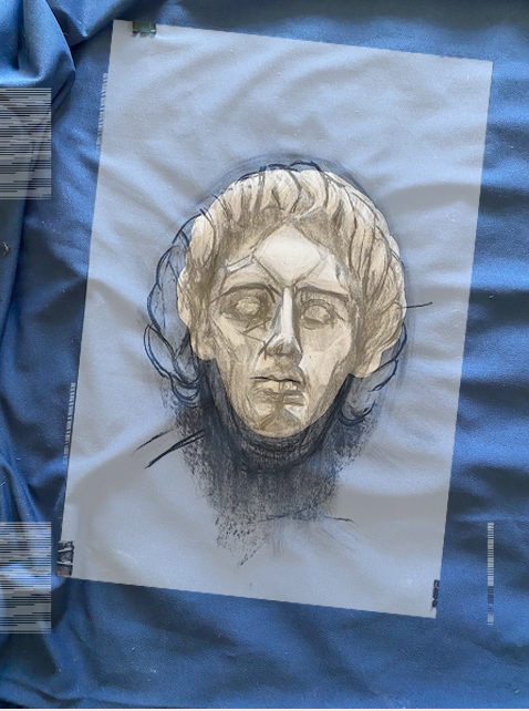 Eigentlich wollte ich die ausgeliehenen Gipsköpfe nur einwickeln, um sie der Zeichenschule zurückzuerstatten. Da fand ich die Jünglingsmaske auf dem blauen Tuch plötzlich so interessant, dass ich sie noch einmal zeichnen wollte.