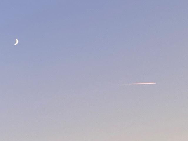 Wie verschieden wirken Mondsichel und Kondensstreifen auf mich, die Betrachterin! Was macht es mit mir, dass die silberne Sichel links oben schwebt und dem Bild den gerundeten Rücken zuwendet, während das unsichtbare Flugzeug nach rechts rast und einen von der untegehenden Sonne golden gefärbten und schnell vergehenden Strich ins Taubenblau zeichnet…..