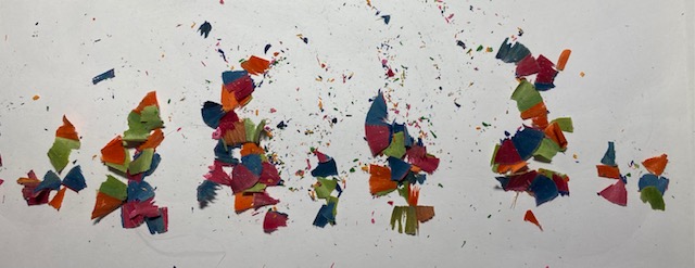 Eben, als ich darauf wartete, dass mein Computer lud – ich hatte ihn wegen eines kurzen Stromausfalls ausgestellt -, spitzte ich dicke Buntstifte, die es seit langem nötig hatten. Die Buntstiftspitzschnipsel waren hübsch anzusehen, und so mochte ich nicht entsorgen, bevor ich ein Bildchen daraus gelegt hätte.