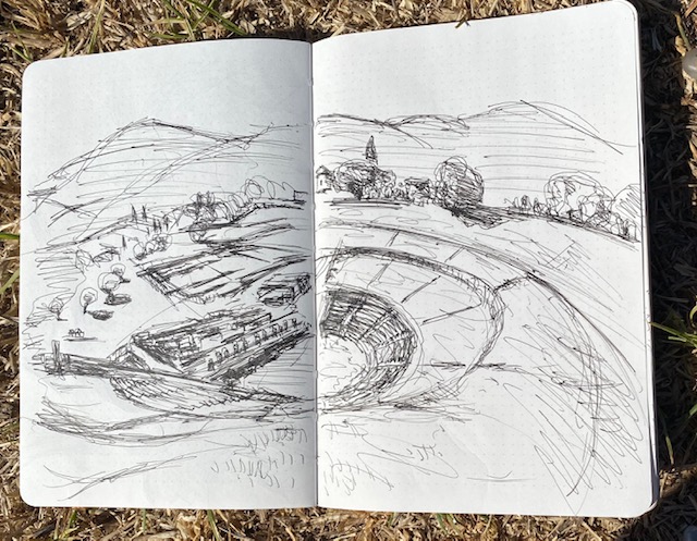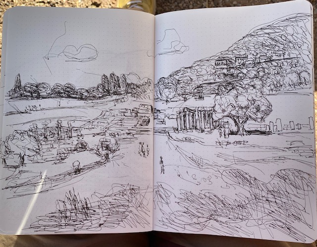Heute begab sich die Paneurhythmiegruppe dorthin, um an einer Führung teilzunehmen und danach an einem abseitigen Platz zu tanzen. Ich hatte keine Lust auf die Führung, da ich die Geschichte des Ortes gut genug kenne. Stattdessen machte ich endlich mal wieder ein paar Zeichnungen.