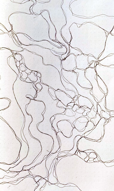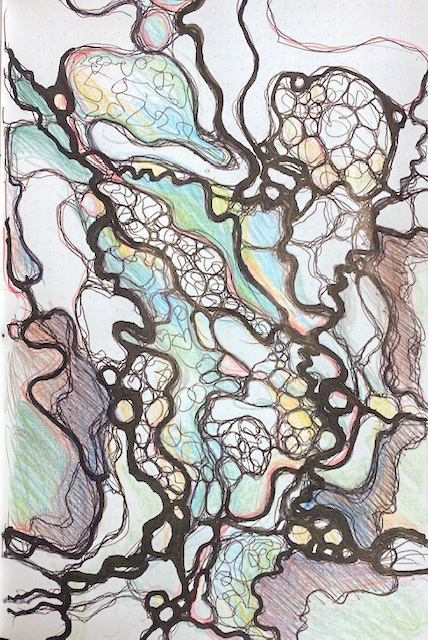Als ich sinnend vor den Lichtkringelspielen sitze (hier), fällt mir ein, dass sich in meiner Tasche mein Zeichenbuch befindet. Warum nicht versuchen, dieses Spiel zu zeichnen? Aber nicht als realistische Wiedergabe, sondern meditativ-neurografisch?