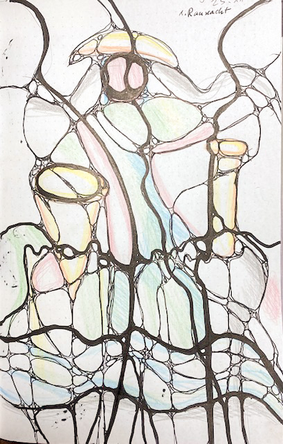 Ab wann man die Raunächte zählt, ist verschieden. Ich beginne mit der Nacht zum 26.12. und ende mit der Nacht zum 6. 1.. Ich setzte ich daher in der vergangenen Nacht hin und guckte, was es wohl im nächsten Januar – dem Spiegelmonat für die erste Raunacht – zu bedenken und zu bearbeiten gibt. Als Impulsgeber benutzte ich die Tarotkarten. Die gezogene Karte übersetzte ich in eine neurografische Zeichnung.