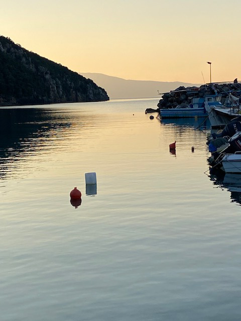 Heute Nachmittag war so schönes Licht, dass ich mich zum kleinen Hafen Kitries aufmachte, um ein bisschen herumzustreunen. Meinen Zeichenblock nahm ich mit, doch blieb er in der Tasche. Zu kalt war die Luft, die vom verschneiten Taygetos an unsere sonnige Küste strömte.