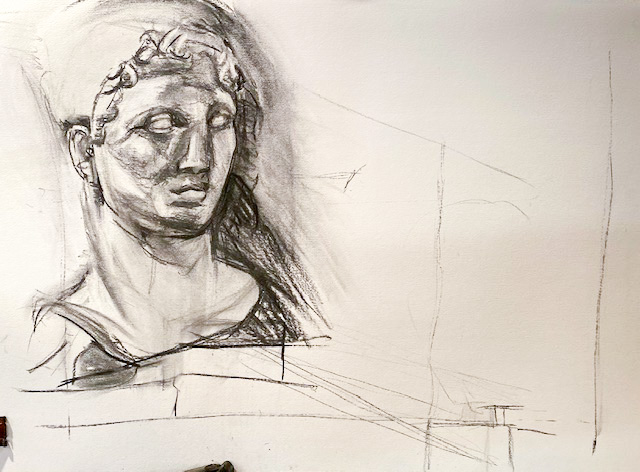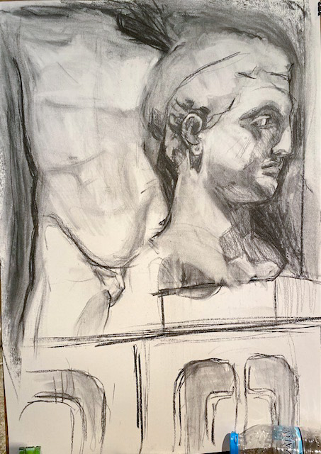 Ja, ich war wieder in der Zeichenschule, das dritte Mal in dieser Woche. Es ist grad meine Zuflucht, weil mein Atelier immer noch unbrauchbar ist. Heute habe ich ein bisschen an der am Dienstag begonnenen Zeichnung des Jünglingskopf herumgebessert …
