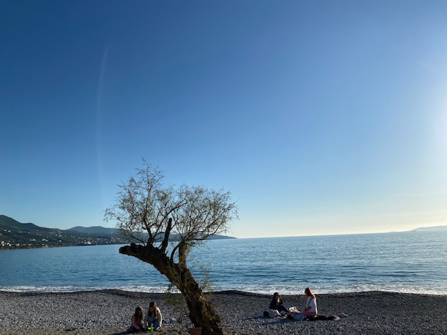 Die Sonne ist wieder da, nach Tagen mit Regen und Gewölk, und so verabredeten wir uns zum Paneurhythmietanzen am Strand vor einem jetzt geschlossenen Großhotel Kalamatas. Ich war etwas früher da, zog mir drei der vier Hüllen aus und sonnte mich, watete auch ein bisschen im Meer, in dem einige Unentwegte schwammen.