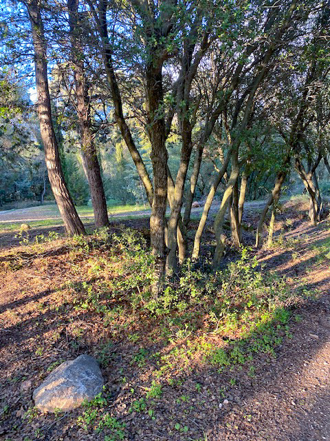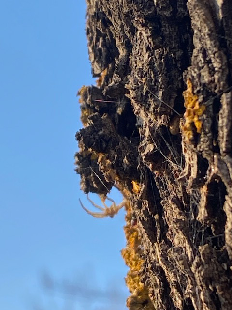 In den Mandelbäumen flatterten und zwitscherten Vögel. Ich lehnte mich an einen der alten Stämme und wartete. Würden sie sich mir zeigen? Nein. Nur ein Spinnchen, das ganz bewegungslos an der rauen Rinde hing, ließ sich fotografieren. Von ihr ging ein Faden abwärts. Ich fasste ihn zwischen den Fingern, um seine Spannkraft zu prüfen und vielleicht die Spinne in Bewegung zu setzen. Die aber blieb regungslos. Können Spinnen bei Kälte eigentlich laufen?
