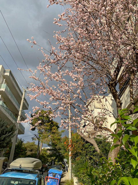 Windig war es und eisig kalt, aber die Mandelbäume stehen in voller Blüte. Ich sah es, als ich heute in Maroussi (nördlicher Vorort von Athen) meine Runden drehte.