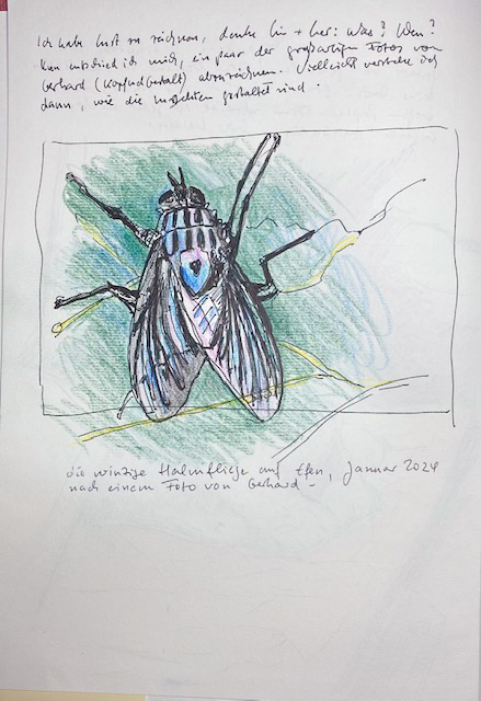 Schließlich nahm ich das nächstbeste, mit der Vornahme, dass es nicht das letzte sein würde. Das Skizzenbuch ist ja noch fast leer, da ist viel Platz für weitere Studien. Dies ist eine Fliege* auf Efeu, im Januar 2024 von Gerhard fotografiert (https://kopfundgestalt.com/2024/02/02/januargeschehen-auf-dem-efeu/).
