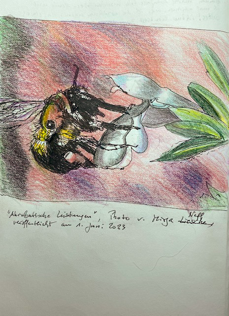 Das Foto für diese Zeichnung stammt von einer anderen Insekten-Spezialistin und-Fotografin, meiner Nichte Mirja Neff. Sie machte es in Polylimnia, als sie mich im Juni 2023 besuchte. „Akrobatische Leistungen“ betitelte sie das Foto.