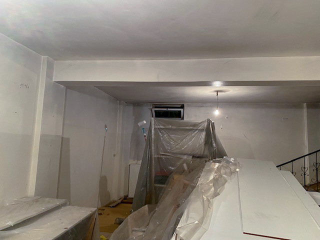 Diese Flüssigkeit sowie 20 l mit weißer und 3 l mit abgetönter Farbe, Klebebänder, Abdeckfolien, drei Roller zum Streichen und etliches mehr besorgte ich heute vormittag in Kalamata. Ich freue mich über den Fortgang der Arbeit, zu dem ich momentan weiter nichts beitragen kann.