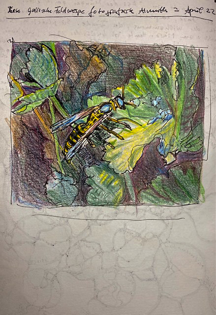 Heute war ich nochmal bei Almuth (NaturaufdemBalkon) unterwegs, auf der Suche nach einem Insektenfoto, das ich abzeichnen wollte. Die Auswahl war schwierig. Ich entschied mich schließlich für eine gallische Feldwespe, die grad beim Wasserschöpfen ist. (hier).