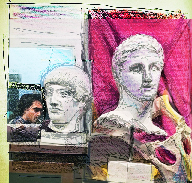 Gestern fuhr ich nach Kalamata, um nach Modell zu zeichnen, doch der Termin fiel aus. So machte ich nur ein Foto der dort aufgestellten Gipsköpfe, mit dem Gedanken, sie auch einmal mit Kugelschreiber und Buntstiften zu zeichnen. Das Ergebnis lässt sehr zu wünschen über, doch immer lernt man auch zu, wenn etwas nicht gelingt.