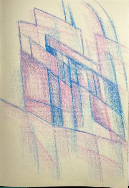 Gestern Nacht spielte ich, während ich eine Sendung hörte, ein wenig mit den Buntstiften. Zum zärtlichen Blau gesellte sich ein Rosa, und es entstand eine träumerische Vorfrühlings-Architektur.