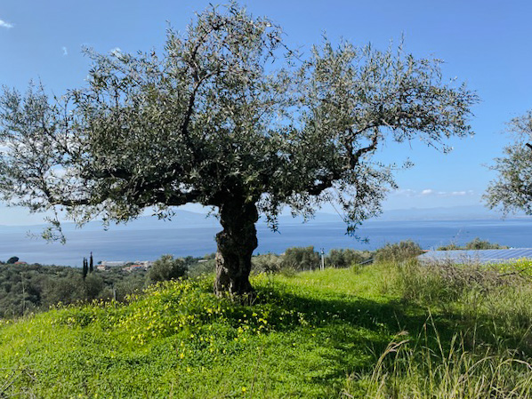 Schön und kalt war es heute morgen. In Attika schneite es, aber hier im Süden der Peloponnes herrscht Vorfrühling: Blau der Himmel, in dem weiße Wolken treiben, weiß und gelb überblüht die smaragdgrünen Olivenhänge, darin ab und an ein Blutsspritzer des Adonis – der roten Anemone. Zartblau wie Himmel und Meer die liebliche Männertreu.
