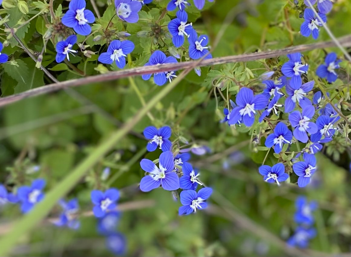 Aha! Danke, Ulrike! Ehrenpreis und Männertreu! Worin besteht wohl der Unterschied? Ich schaute eben noch im Web nach. Ehrenpreis wird offenbar auch als Männertreu bezeichnet (Wiki). Aber Männertreu hat eine fünf-blättrige Blüte, Ehrenpreis ist vier-bättrig. Auf den Abbildungen hat Männertreu drei größere und ein kleineres Blütenblatt, bei mir sind alle vier Blütenblätter gleich groß.
