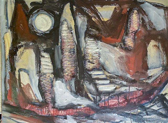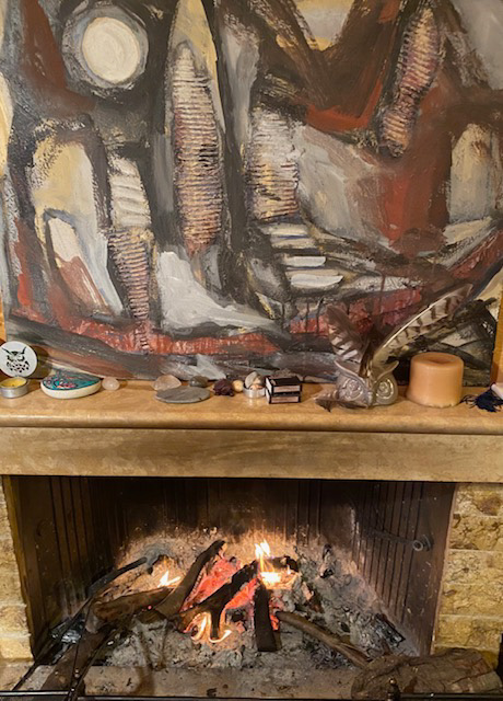 Seit etwa sechs Monaten spielt Babsi ein Instrument, von dem ich zuvor nie etwas gehört hatte: die Handpan (hier). Am 4. März postete sie ein Video, in dem sie ihre Fotografie und Malerei mit dem Spiel dieses Instruments unterlegte (hier). Ich war fasziniert und fragte an, ob sie Lust habe, auch eines meiner Bilder mit ihrer Musik zu interpretieren und ihm dadurch eine weitere Dimension zu geben. Das Bild, das ich ihr schickte, steht auf dem Kaminsims, und seine Farben gleichen dem des verbrennenden Holzes. Ich nenne es „Abstieg in die Totenwelt“.