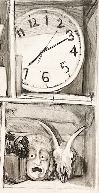 Auch heute ging ich in die Zeichenschule, setzte mich vor ein Regal mit allerlei Krimskrams und machte mich daran, es möglichst exakt abzuzeichnen. Drei Stunden zeichnete ich. Es war eine ziemliche Herausforderung und Geduldsprobe, all diese Gegenstände wiederzugeben.