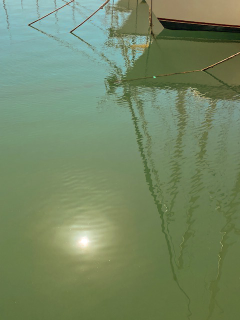 Spiegeleien klingt ja fast wie Spiegeleier, und tatsächlich war es heute zeitweise so heiß, dass man hätte Spiegeleier braten können. Am Hafen aber wehte ein sehr leises Lüftchen und fächelte mir Kühlung zu, während ich die Zeichenkunst im Hafenbecken bewunderte.