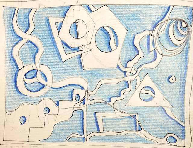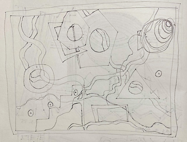 Zu meiner Erholung zeichnete ich dann mit Kugelschreiber ein weiteres „Ausmalbild“ in mein Skizzenbuch. Ich fand es interessant, den Linien zuzuschauen, wie sie eine illusorische Welt erschaffen.