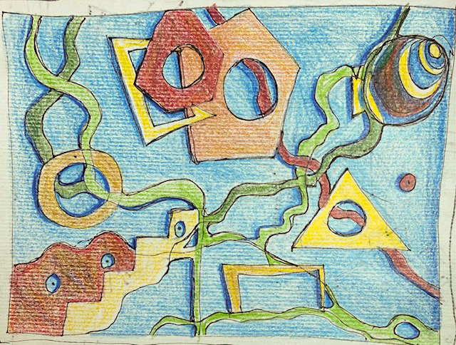 Eine weitere Differenzierung der „Gegenstände“ erfolgt durch unterschiedliche Einfärbung. Selbstverständlich ist diese hier nur eine von vielen Möglichkeiten, das Liniengewirr in eine dreidimensional wirkende Scheinwelt zu verwandeln.