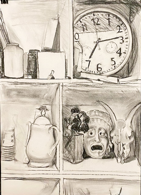 ← In der Zeichenschule 33: Regal mit Maske, Ziegenschädel, Uhr und Gefäßen (2)
