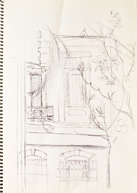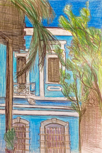 Heute setzte ich mich in ein Cafe nahe am Hafen, trank einen Espresso und zeichnete auf die Schnelle das gegenüberliegende blaue Haus. Ein schönes Haus, finde ich, mit sehr hübschen Details. Ich verhedderte mich daher beim Zeichnen von Balkons, Fensterrahmungen, Jalousien und so war die 20-minütige Pause rum, bevor ich die Buntstifte ausgepackt hatte.