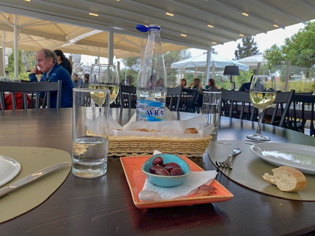 Nach diesem bilder- und geschichtsreichen Rundgang lassen wir uns in der Gaststätte nieder. Und schon werden Brot und Oliven, Wasser und Wein herbeigetragen. Essen werde ich überbackene Auberginen…